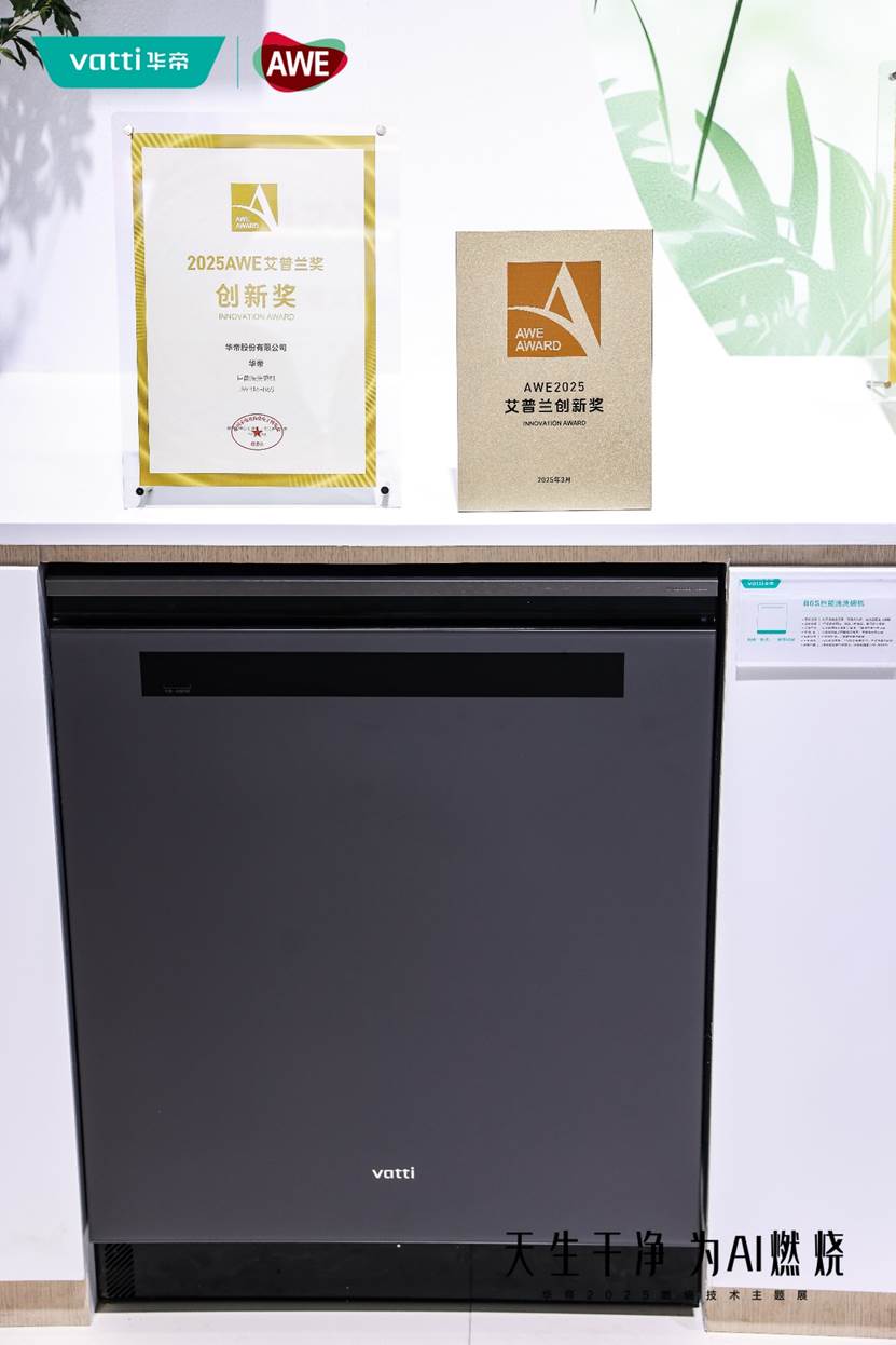 期间,2025AWE艾普兰奖揭晓。华帝“巨能洗”洗碗机JWB16-B6S凭借行业首创的双子变距全域洗科技、智能投放技术及第三代零残留干态抑菌技术,一举斩获“艾普兰创新奖”。