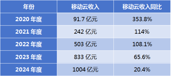 数据显示,2024年度,移动云收入为1004亿元,同比增长达20.4%。