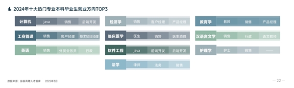 计算机、软件工程2个专业的毕业生集中于java开发、前后端开发等技术岗,对口度高,体现了IT行业的技术壁垒。
