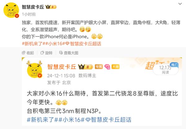 该博主透露,一款首发机提速,新开案国产护眼大小屏,直屏窄边,直角中框,大R角,轻薄化,全系潜望超声。其虽然没有透露该机型号,但是其在微博下方贴了一张曾经的截图,图中提到了小米16系列。他表示,小米16系列将首发第二代骁龙8至尊版,新移动平台将采用台积电第三代3nm制程打造。
