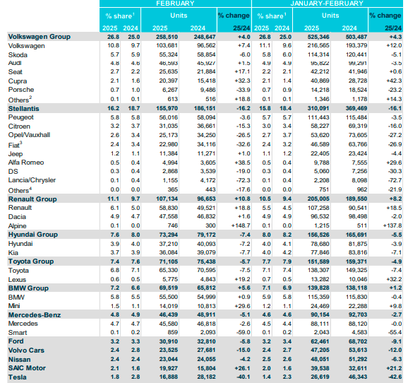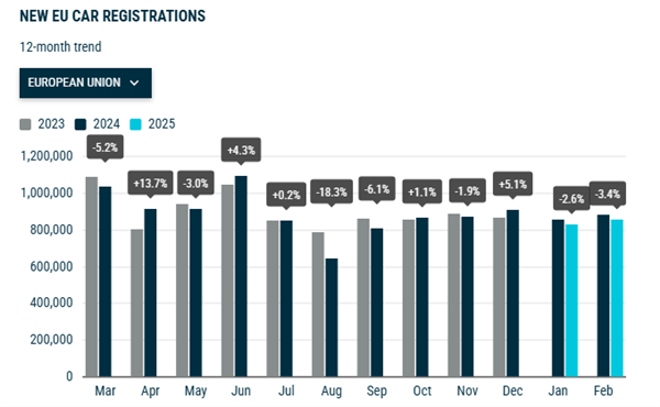 根据欧洲汽车制造商协会发布的数据,由于经济不确定性导致消费者抑制购买大件商品,欧洲汽车总销量2月份出现了五个月来最大降幅——新车注册量较上年同期下降3.1%至963540辆。