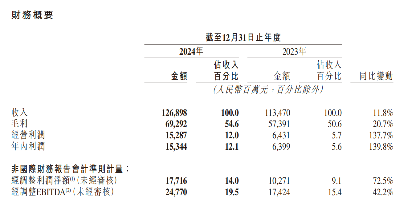 3月25日,快手科技(1024.HK)发布2024年第四季度及全年财报。财报显示,快手2024年营收1269亿元,较上年同期的1134.7亿元增长11.8%;经调整利润净额177.16亿元,同比增长72.5%;毛利率为54.6%,上年同期为50.6%。