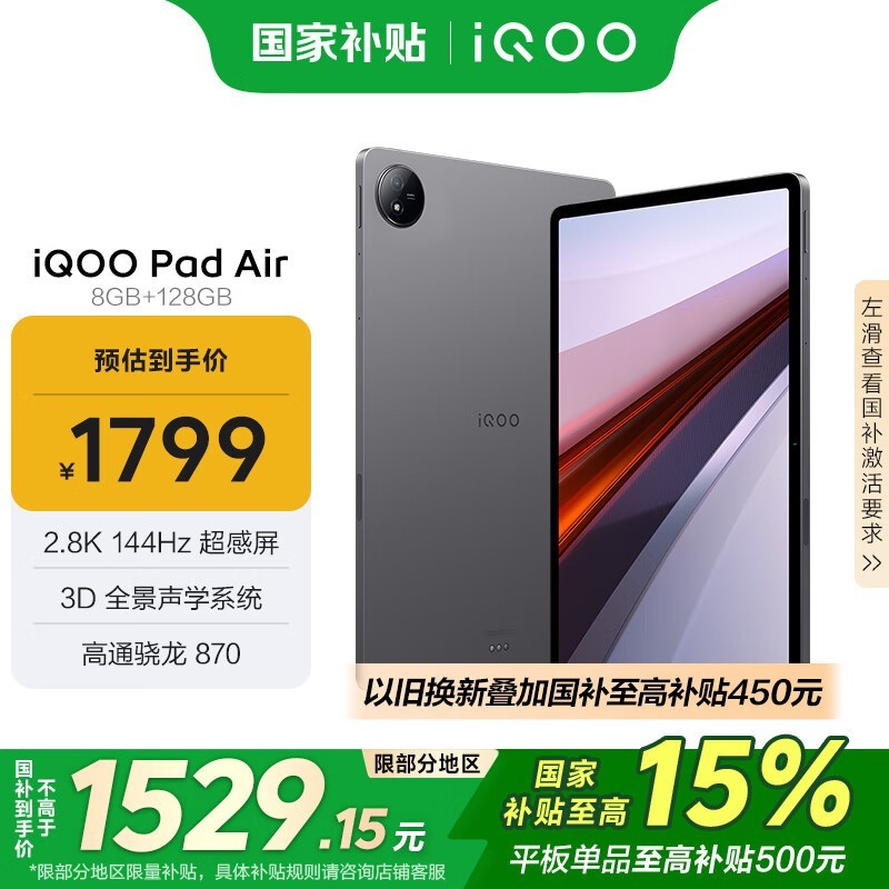 iQOO Pad Air骁龙870芯片11.5英寸2.8K超感屏京东优惠价1759元