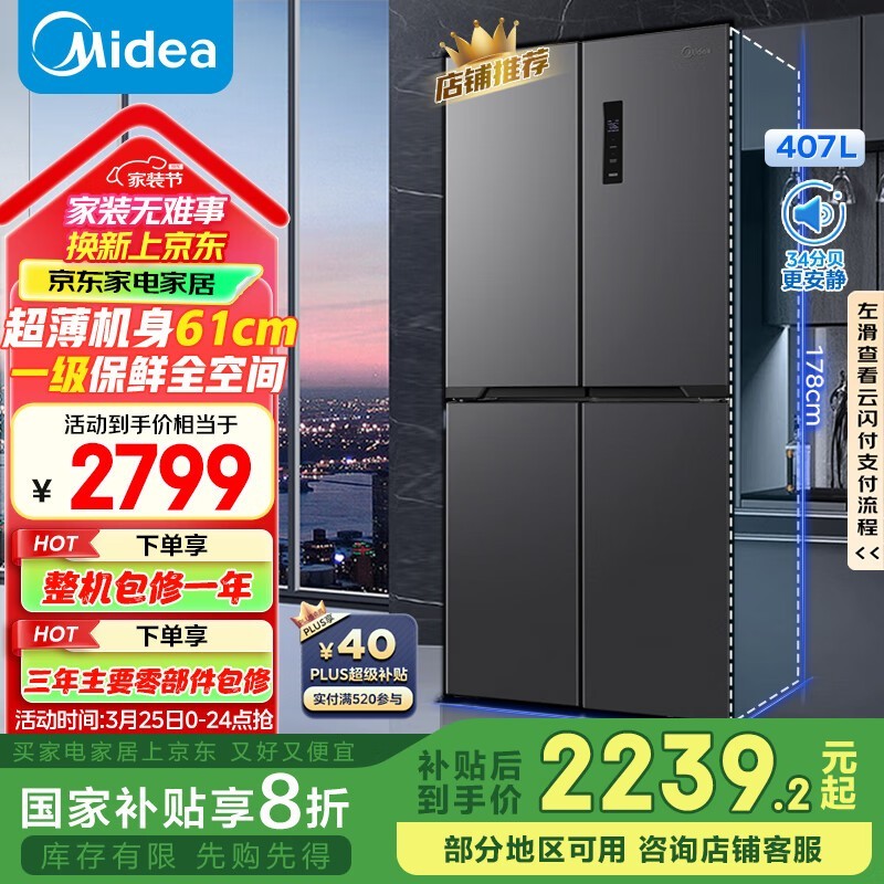 美的407升十字对开冰箱促销,到手价1972元