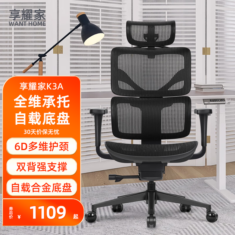 享耀家WantHome K3A人体工学椅幻影黑高端网布电脑椅