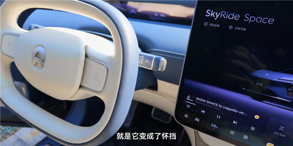 然后走进车内,这次方向盘也有个大的改变,除了尺寸更小,形状更方以外,右边还多了一个换挡拨杆,之前蔚来都是把换挡设计在中控位置。