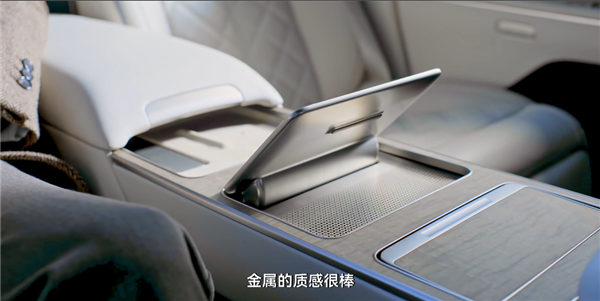然后咱们到后排, ET9 中岛这里其实也有一个屏幕,扶手打开还有一个小桌板,但我觉得最喜欢的还是屏幕打开后,下面这种镂空的质感,特别奢华。