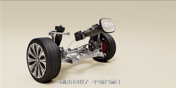 先说这个线控转向。相比传统转向的硬链接模式, ET9 取消了物理转向柱,没有机械结构,只通过一个方向盘给转向机构提供一个电信号,相当于手柄打游戏了。