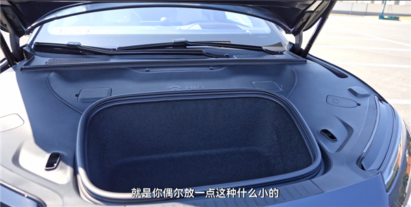打开后的前备箱看起来有点像是跑车的前备箱,虽然不大,但可以放一点随身的小物件,里面是有关闭的实体按键,但也可以车底踢一脚再让它自动关上。