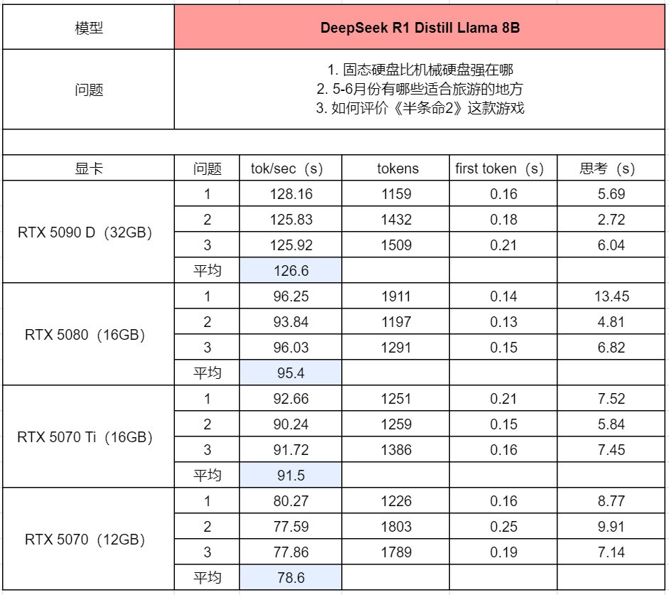 在32B模型中,可以看到RTX 5090 D的tok/sec还是很快的,毕竟作为本代旗舰产品,32GB大显存本就适合AI训练。