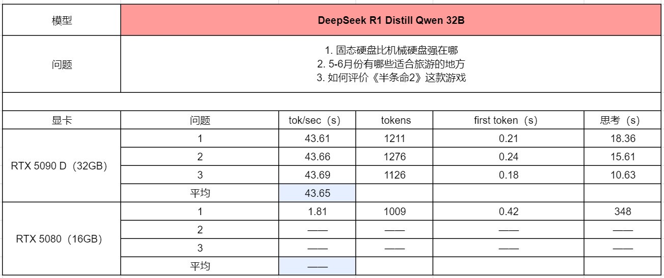 所以32B模型需要的最低显存,为18.4GB左右,这已经超出了RTX 5080的16GB显存。而这溢出的2GB显存,则由内存补足。