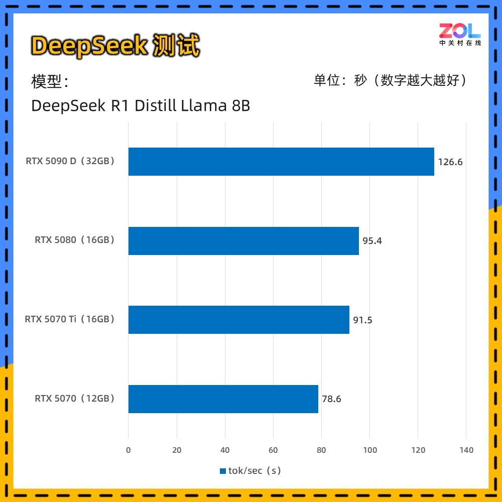 对于大显存高算力的RTX 5090 D毫无意外拔得头筹,而显存相同RTX 5080及RTX 5070 Ti差距不大。根据不同显卡之间的AI算力来看:
