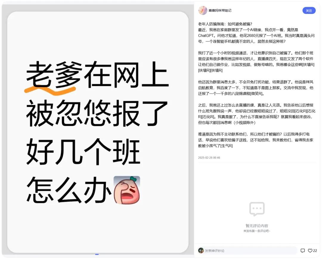 无奈的她上网发帖求助,结果有同感的年轻人还真不少:“我家现在跟你一样情况,学的热火朝天,我说骗子,我爸说我不思进取,现在流行AI,也是2680学费”“这种机构层出不穷,我妈也一个劲想报,关键是课程内容驴头不对马嘴的,都是骗人的废话”……