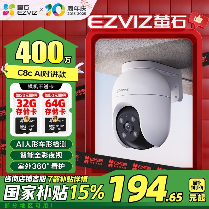 萤石8系列400万高清无线摄像头促销仅199元