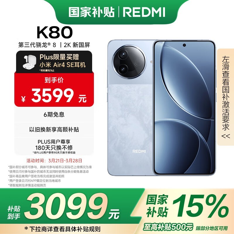 红米K80 5G(16GB+1TB汐月蓝)京东优惠价2535元