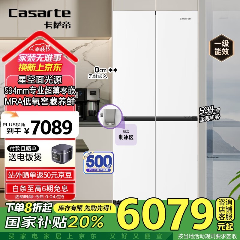 卡萨帝星空477升超薄零嵌十字四开门冰箱仅5422元