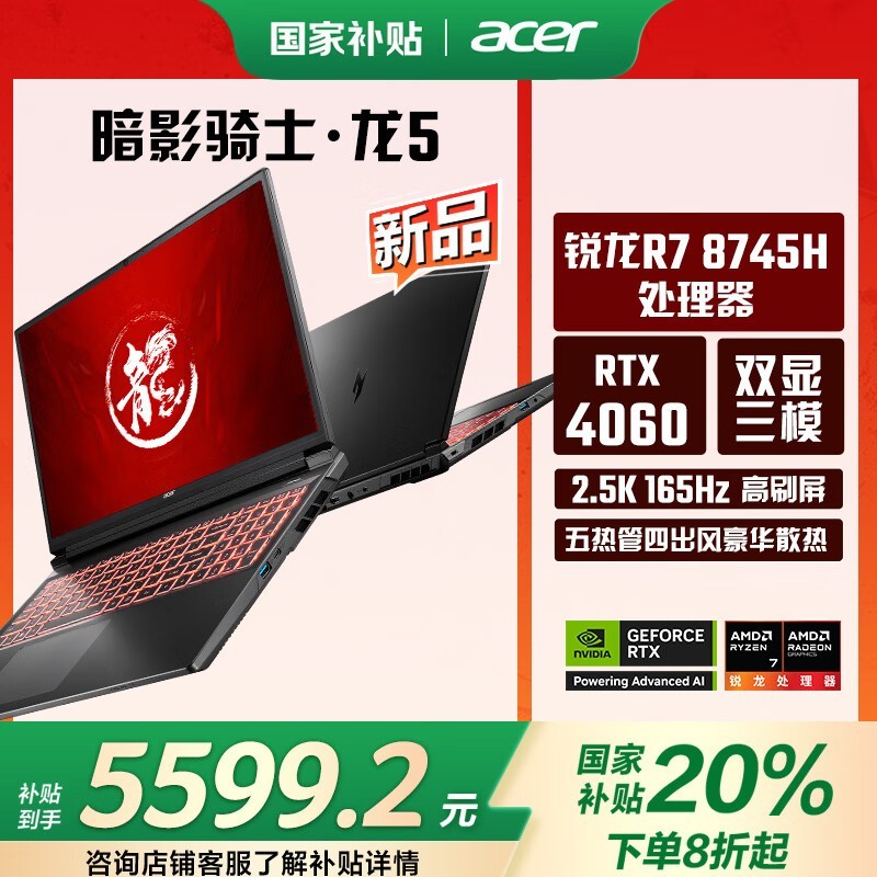 宏碁暗影骑士·龙5游戏本 AMD R7+RTX4060 16英寸京东特惠5599元