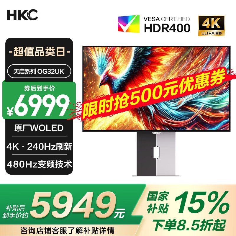 HKC OG32UK电竞显示器4K OLED 240Hz刷新率促销