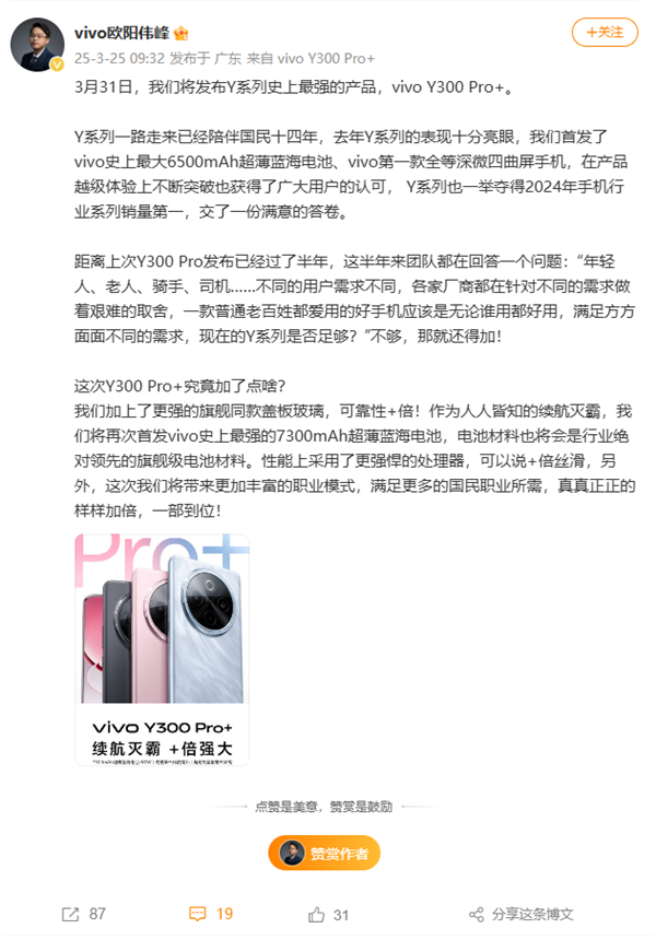 快科技3月26日消息,vivo Y300 Pro+昨天正式官宣3月31日发布,这是一款主打超长续航的新机,目前已经在各大平台上架,开启预约。