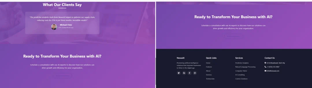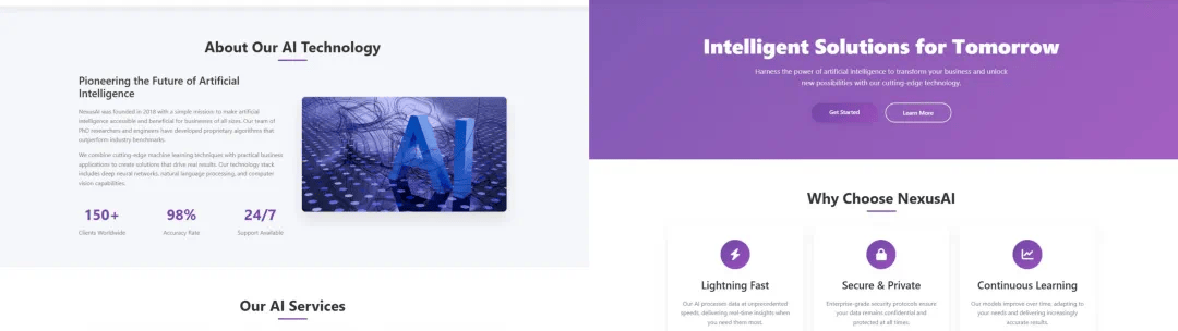 提示词如下,大家也可以自行尝试:为AI公司「NexusAI」创建一个外观精美的响应式首页,将所有内容包含在一个HTML5文件中。结果如下图所示,所有图像,包括用户故事和他们的面孔,一切都是用这个提示完成的。