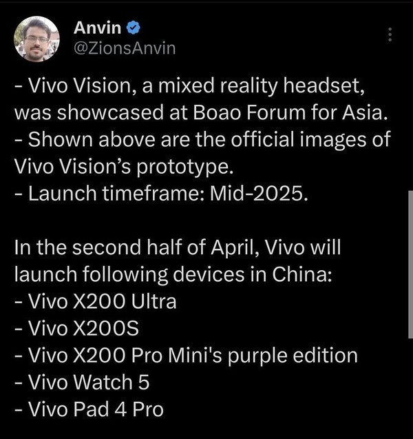 该博主透露,vivo可能会在4月下半月召开新品发布会,而相关新品数量也不少,包括不少人期待的超大杯机型vivo X200 Ultra、标准版小迭代机型X200s、新的智能手表vivo Watch 5和新平板vivo Pad 4 Pro。此外,vivo X200 Pro mini虽然不会带来迭代机型更新,但是也会推出一个新的紫色配色,以丰富消费者选择。