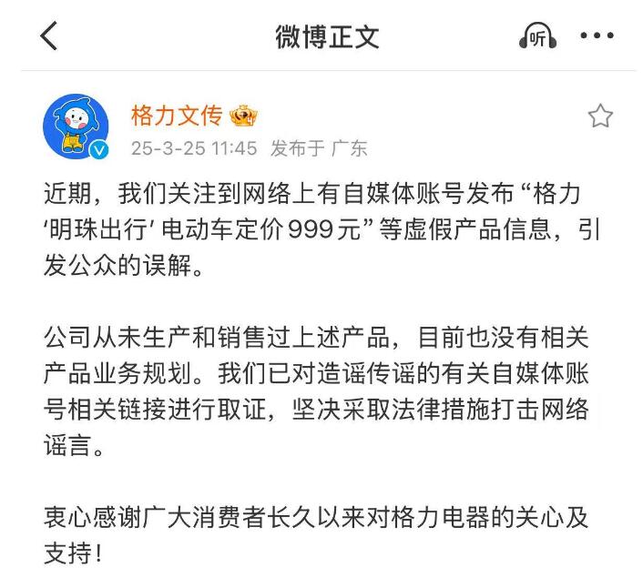 3月25日,格力电器通过“格力文传”微信公众号发文称,近期,关注到网络上有自媒体账号发布“格力‘明珠出行’电动车定价999元”等虚假产品信息,引发公众的误解。格力电器表示,公司从未生产和销售过上述产品,目前也没有相关产品业务规划。