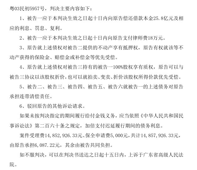 一审判决显示,托吉斯应于本判决生效之日起十日内向原告偿还借款本金25.8亿元及相应的利息、罚息、复利,上海银行享有深业物流提供的不动产抵押权、托吉斯集团对托吉斯100%股权的质权,深业物流、托吉斯集团、宝能投资、宝能控股、姚振华应承担连带清偿责任。
