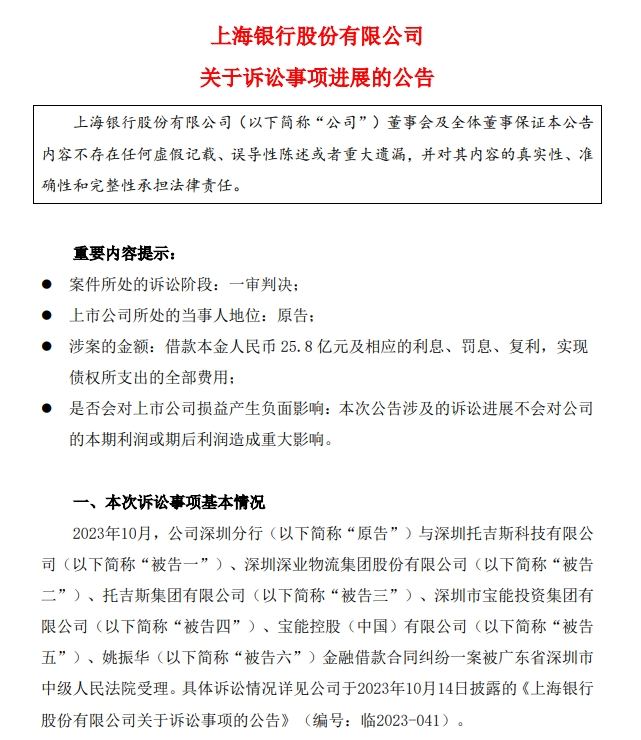 公告显示,上海银行深圳分行于近日收到《广东省深圳市中级人民法院民事判决书》(2023)2粤03民初5957号。