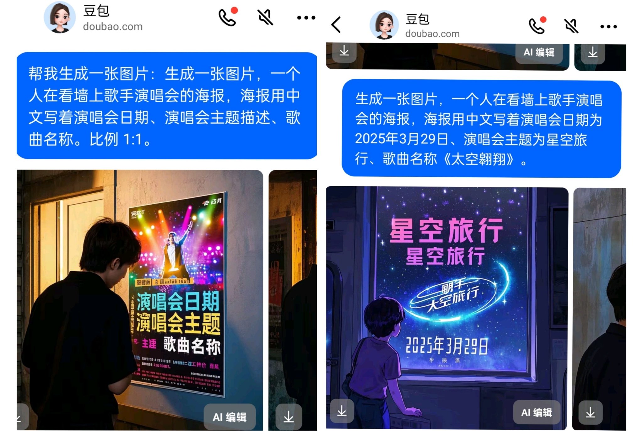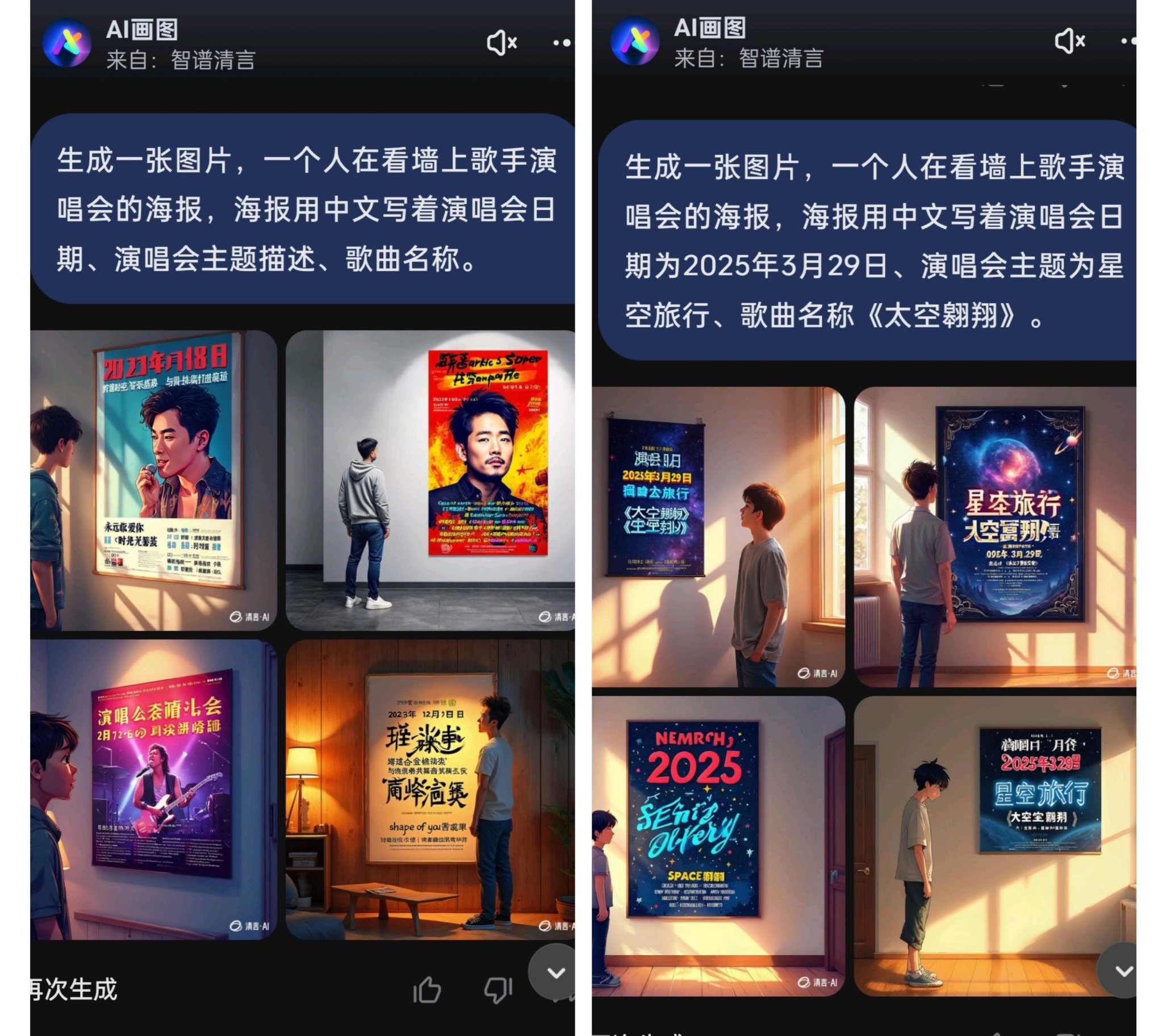 随后记者将提示词改为“一个人在看墙上歌手演唱会的海报,海报用中文写着演唱会日期为2025年3月29日、演唱会主题为星空旅行、歌曲名称《太空翱翔》”,豆包呈现出了正确的日期和“星空旅行”字样,仍有一些字是乱码,智谱清言也生成了一些乱码。