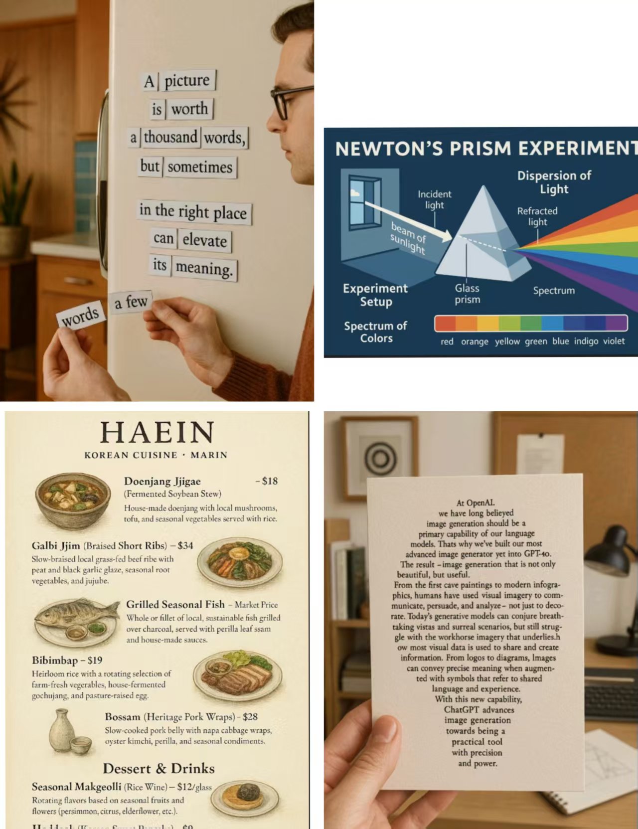 在其他示例中,OpenAI要求大模型生成上世纪中叶一个家庭中冰箱上贴着的诗歌短句,并要求画面中的人手拿着特定的几个词,GPT-4o可以精准还原。GPT-4o还能生成漫画,但需要人准确地描述画面中的情节。OpenAI还展示了这个图像生成功能在科学实验中的用途,该功能可以生成牛顿棱镜实验的示意图。此外,OpenAI还展示了该图像生成功能在生成路牌、菜单、游戏画面时的效果,以及生成鸡尾酒配方、天气信息图像时,大模型生成的专业配方和天气文本描述。