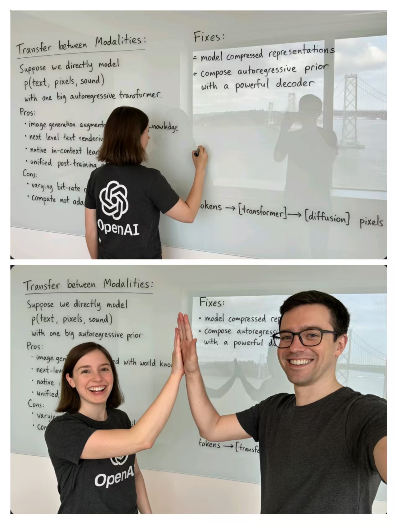 在OpenAI的示例中,要求大模型生成一名女子在一个俯瞰海湾大桥的房间里用笔在白板上写字,衣服上印有OpenAI字样,白板映着摄影师的身影,并描述了白板上所写的文字。GPT-4o生成的图像都体现了以上要求。随后,OpenAI要求摄影师走到镜头前与女子击掌,GPT-4o也呈现了这一画面,且白板上的字不会变得凌乱,女子的身形和发型也与前一张图像呈现的背影一致。