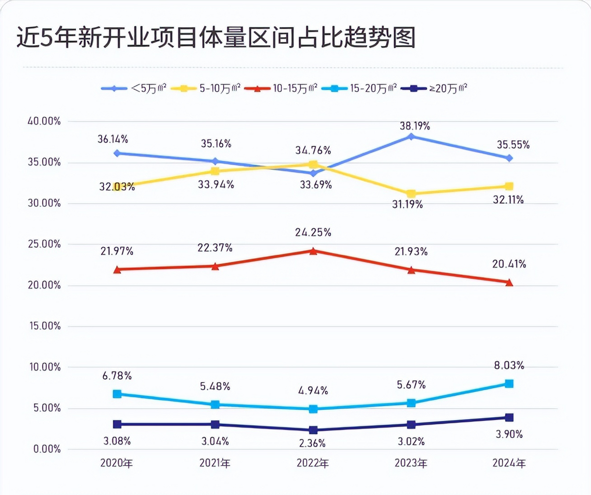 近五年新开业项目体量区间占比结构稳定