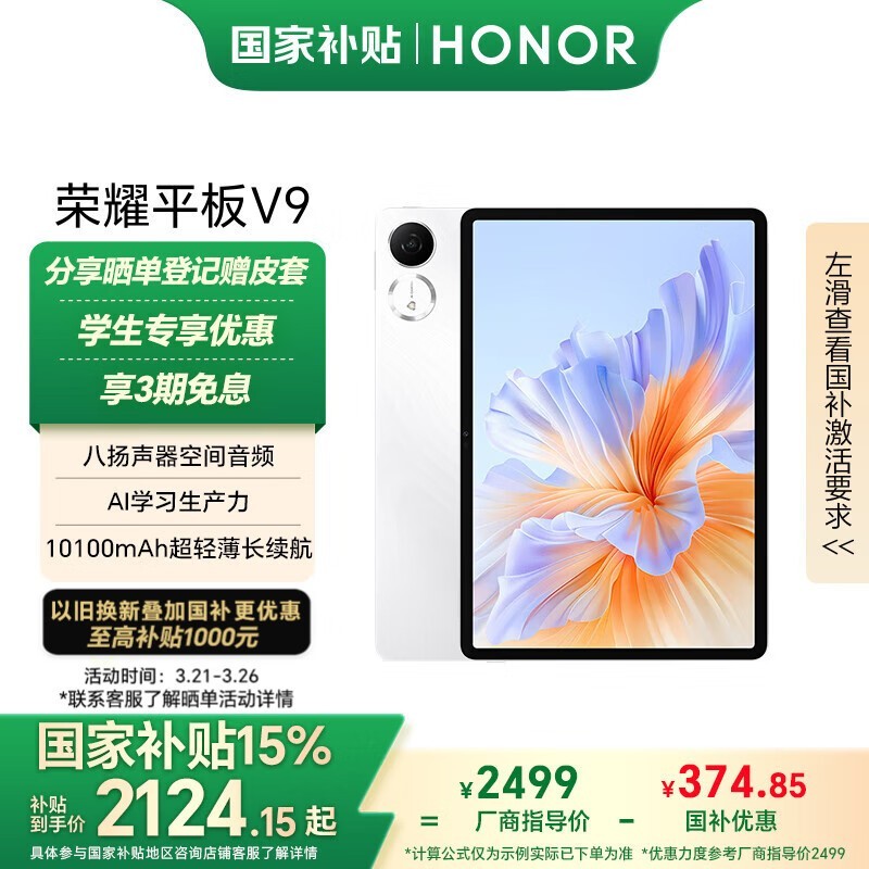 荣耀HONOR平板V9,12GB+256GB,11.5英寸144Hz绿洲护眼屏