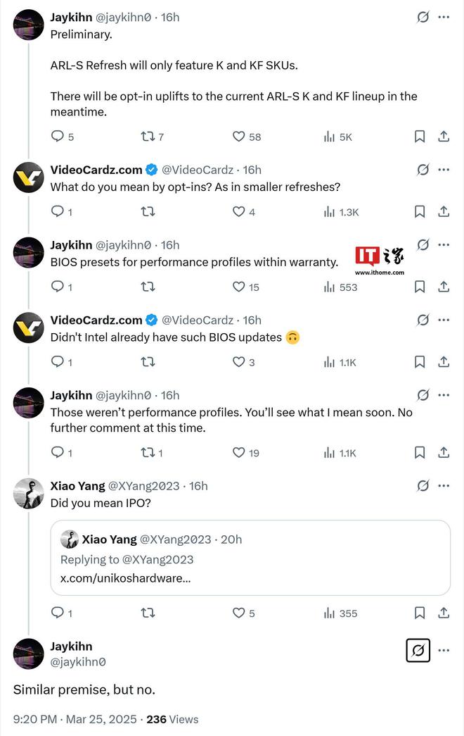 3 月 26 日消息,X 平台消息人士 Jaykihn (@jaykihn0) 北京时间昨日表示,根据其掌握的初步情况,英特尔酷睿 Ultra 200S "Arrow Lake-S" 系列处理器的 "Refresh" 刷新版将仅包含不锁频的 "-K" "-KF" 变体,锁频款式不会更新。