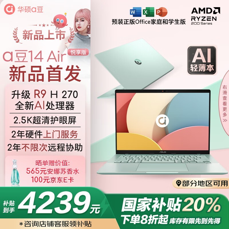 华硕a豆14 Air悦享版轻薄本优惠后4224元