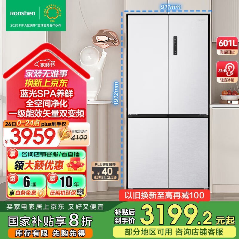 容声蓝光养鲜冰箱601升四开门仅2892元