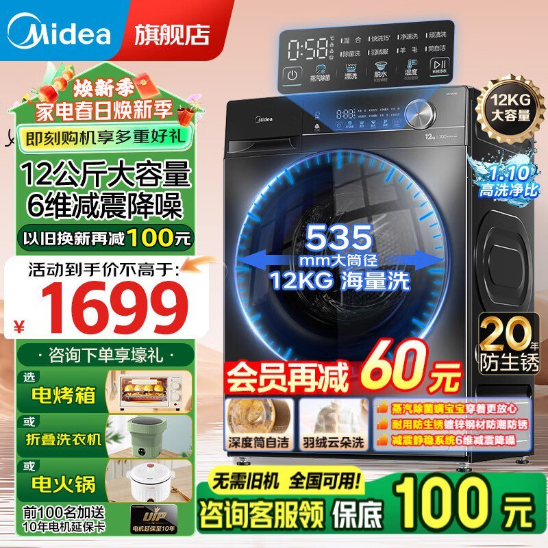 美的MG120V36T 12公斤洗衣机京东优惠价1185元