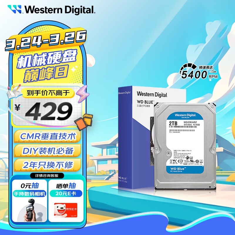 西部数据蓝盘2TB机械硬盘京东低至409元