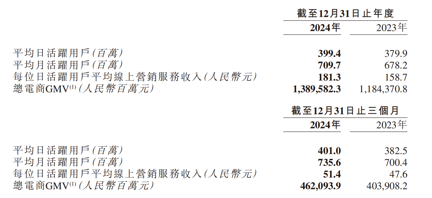 2024年第四季度泛货架电商GMV持续超大盘增长,占比总电商GMV达30.0%。第四季度电商月活跃买家数也同比增长10.0%至1.43亿。
