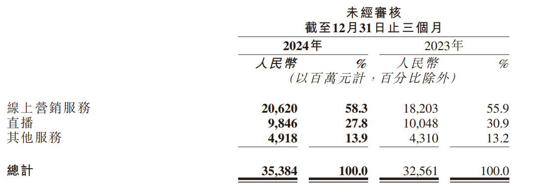 2024年第四季度,快手实现收入354亿元,同比增长8.7%,环比增长13.7%。收入增长主要得益于线上营销服务和电商业务。