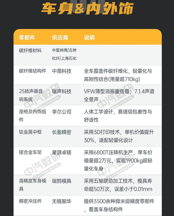 在电机方面,小米SU7 Ultra采用了汇川技术与自研相结合的方案。前置电机V6s由汇川技术提供,功率为288kW;后电机则是小米汽车自研的两台V8s,功率高达425kW,转速可达2.72万rpm,为车辆实现零百加速1.98秒提供了有力支撑。此外,华域汽车提供的压缩机确保了电池与电机的热平衡。