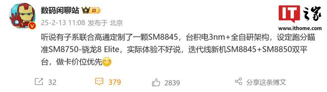 IT之家查询该博主微博记录,发现 SM8845 一词最早出现在今年 2 月 13 日的记录中。当时他表示 SM8845 是一款子系品牌联合高通定制的芯片,采用高通全自研架构和台积电 3nm 制程,设定跑分瞄准骁龙 8 至尊版 SM8750。