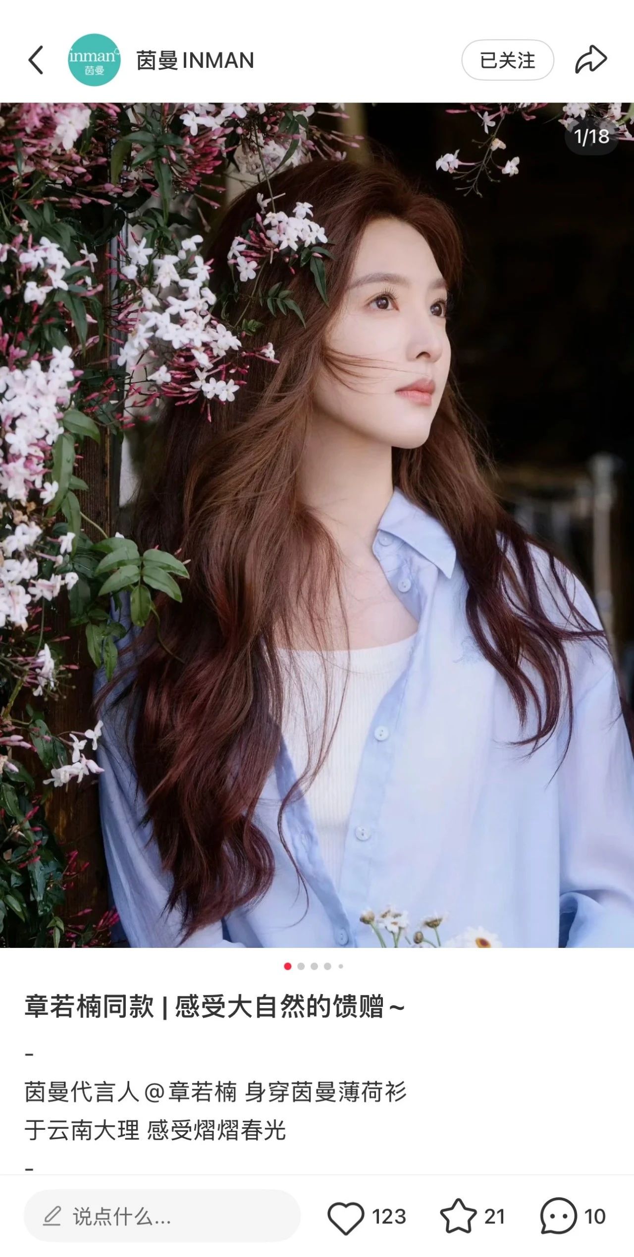 亿邦动力看到,在直播画面中,一处种满亚热带绿植的小院映入眼帘,背后是有风杂货铺的木门,门框上挂着扎染挂饰,营造出独特的氛围。茵曼品牌代言人章若楠以清淡的妆容亮相,身着白衬衫搭配鹅黄色外套和浅蓝色牛仔裤,正轻声唱着《慢慢喜欢你》,羞涩一笑间,尽显邻家女孩的纯真气质。这一画面,成为茵曼此次大秀直播中令人难以忘怀的瞬间。