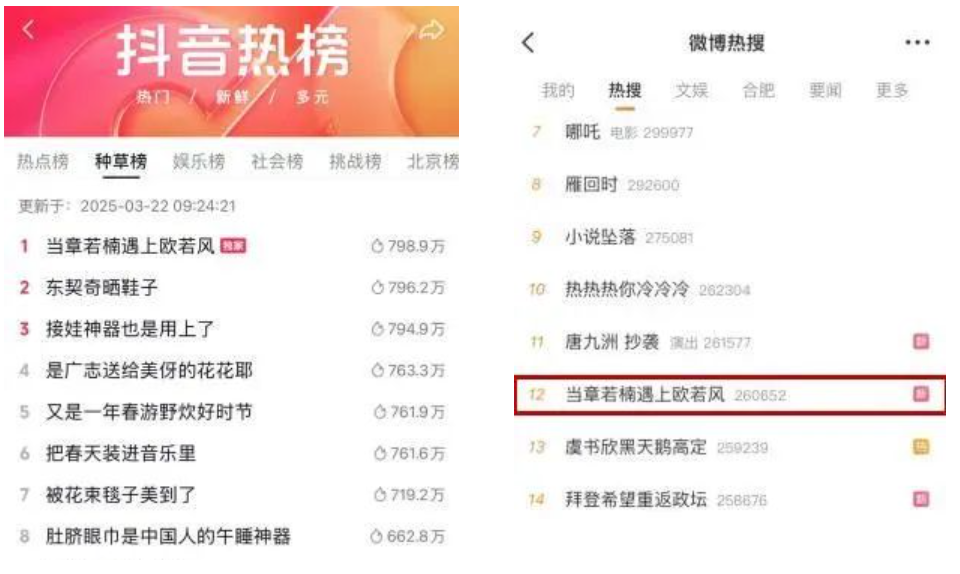 明星的背书与达人的带货相互配合,成功构建起了“秀场即卖场”的消费闭环。数据显示,直播观看人次超过了300万,“当章若楠遇上欧若风”等关键词在抖音的播放量超过6000万,相关词条更是冲上了抖音种草榜第一。