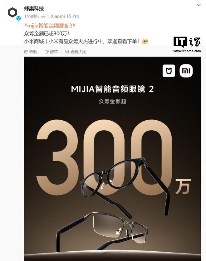 3 月 26 日消息,北京蜂巢世纪科技有限公司官方微博今日发文称,MIJIA 智能音频眼镜 2 众筹金额已超 300 万。