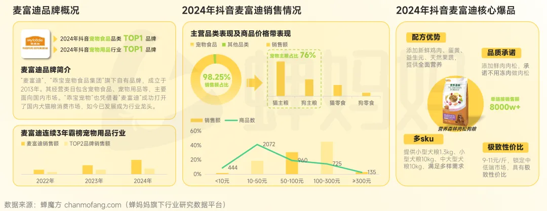 2024年,抖音平台上“麦富迪”表现亮眼,其核心爆品“营养森林肉松狗粮”凭借配方成分、品质承诺、多sku选择、极致性价比等优势,单链接销售额超8000万。此外,“麦富迪”另有3款主粮商品上榜TOP10商品榜单。