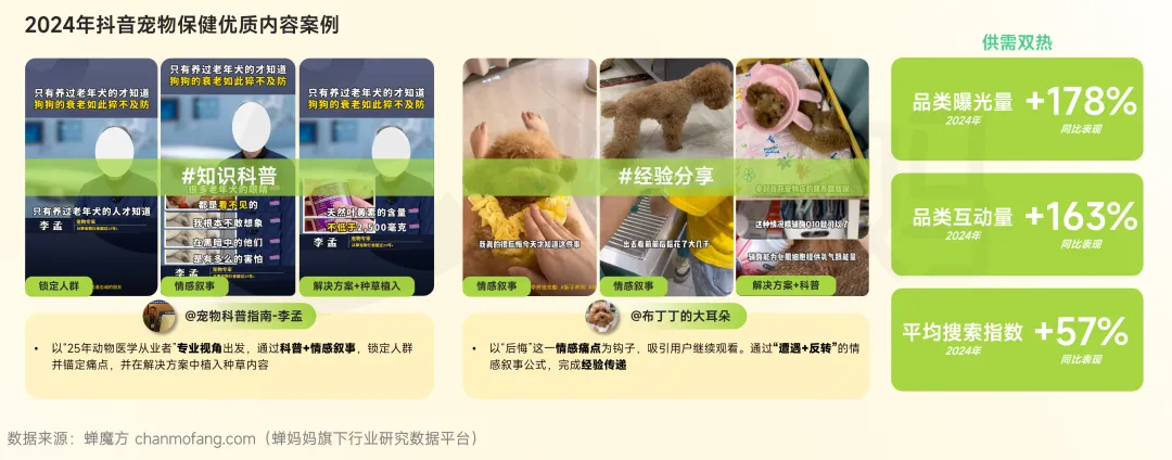 抖音宠物保健品类优质内容的创作逻辑可以总结为:借助专业科普解决信任难题,通过情感叙事放大消费需求,同时辅以可视化的效果对比,进一步增强可信度,从而有效吸引和打动受众。
