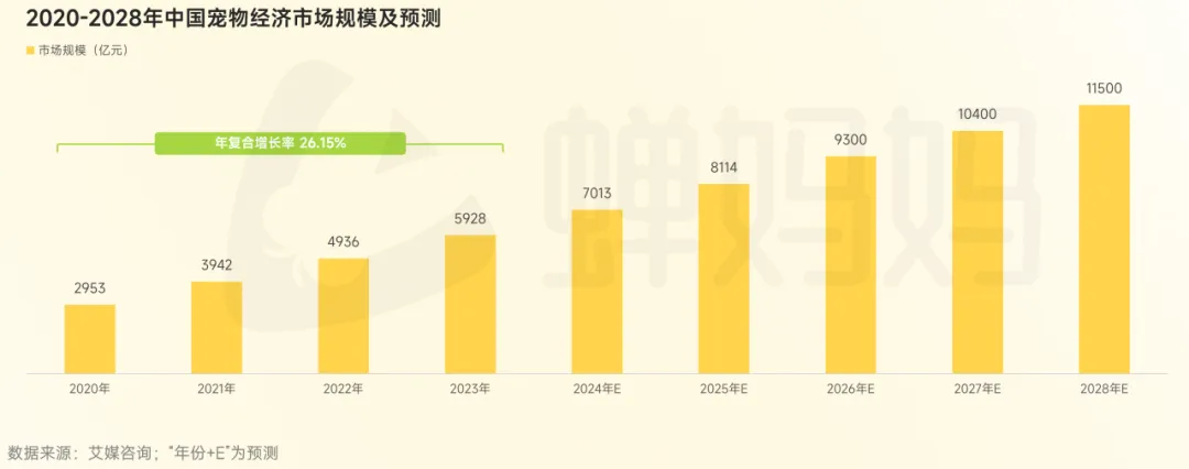 在这样的背景下,中国宠物经济正处于蓬勃发展的黄金时期,2020年至2023年,中国宠物市场年复合增长率为26.15%,预测市场规模将持续上升,2028年市场规模将达11500亿元。
