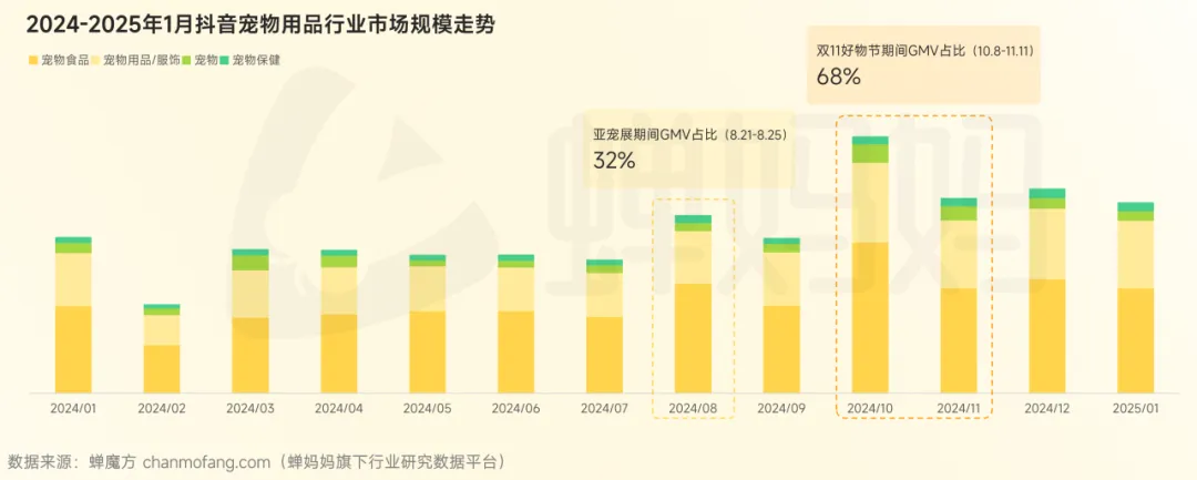 受春节物流停运等因素影响,2月消费短暂回落,但上半年抖音宠物用品行业整体走势较为平稳。8月,抖音商城联动亚宠展、垂类达人、头部品牌等多方力量,以完善的“种收一体化”生态,助力品牌商家生意增长,仅5天活动即贡献当月32%的销售额,带动行业迎来首波销售小高峰。另外,双11大促期间的价格补贴机制,充分激发了消费者囤货和尝新需求,主粮、猫砂等高复购品类集中爆发,助推10-11月成为全年销售峰值。
