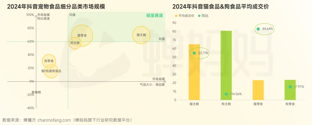 与养狗相比,养猫的日常护理更为简便,对居住空间的要求也相对较低,加之社交媒体上“云养猫”文化盛行,为养猫的流行搭建了重要基础。在此背景下,“猫经济”迅速兴起,并展现出了强劲的增长势头。2024年,猫主粮和猫零食凭借着较大的市场规模和迅猛的同比增速,成为宠物食品下的两大明星赛道。